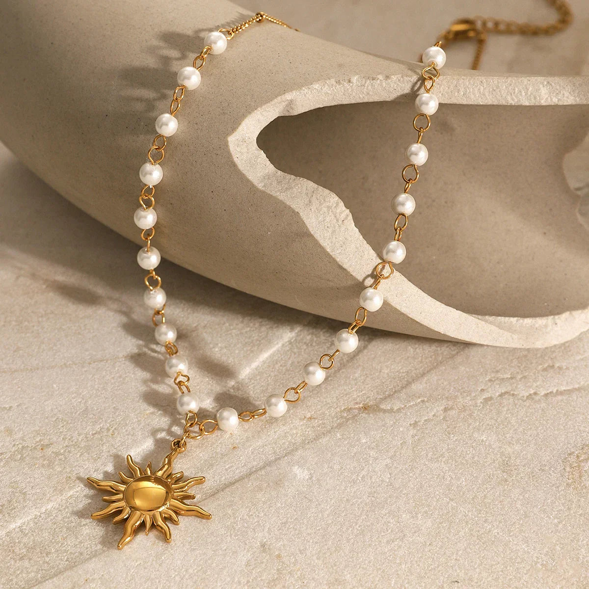 Brighten up any outfit with this elegant sun pendant necklace, featuring a beautiful multi-pearl chain. Perfect for adding a touch of romance and sophistication, this statement jewelry piece is designed to catch the eye. Ideal as a birthday gift or a special treat for yourself, it combines timeless charm with a modern twist. Whether dressing up for a special occasion or adding flair to everyday wear, this necklace is a versatile accessory that shines in any setting. Celebrate individuality and style with this stunning addition to your collection!