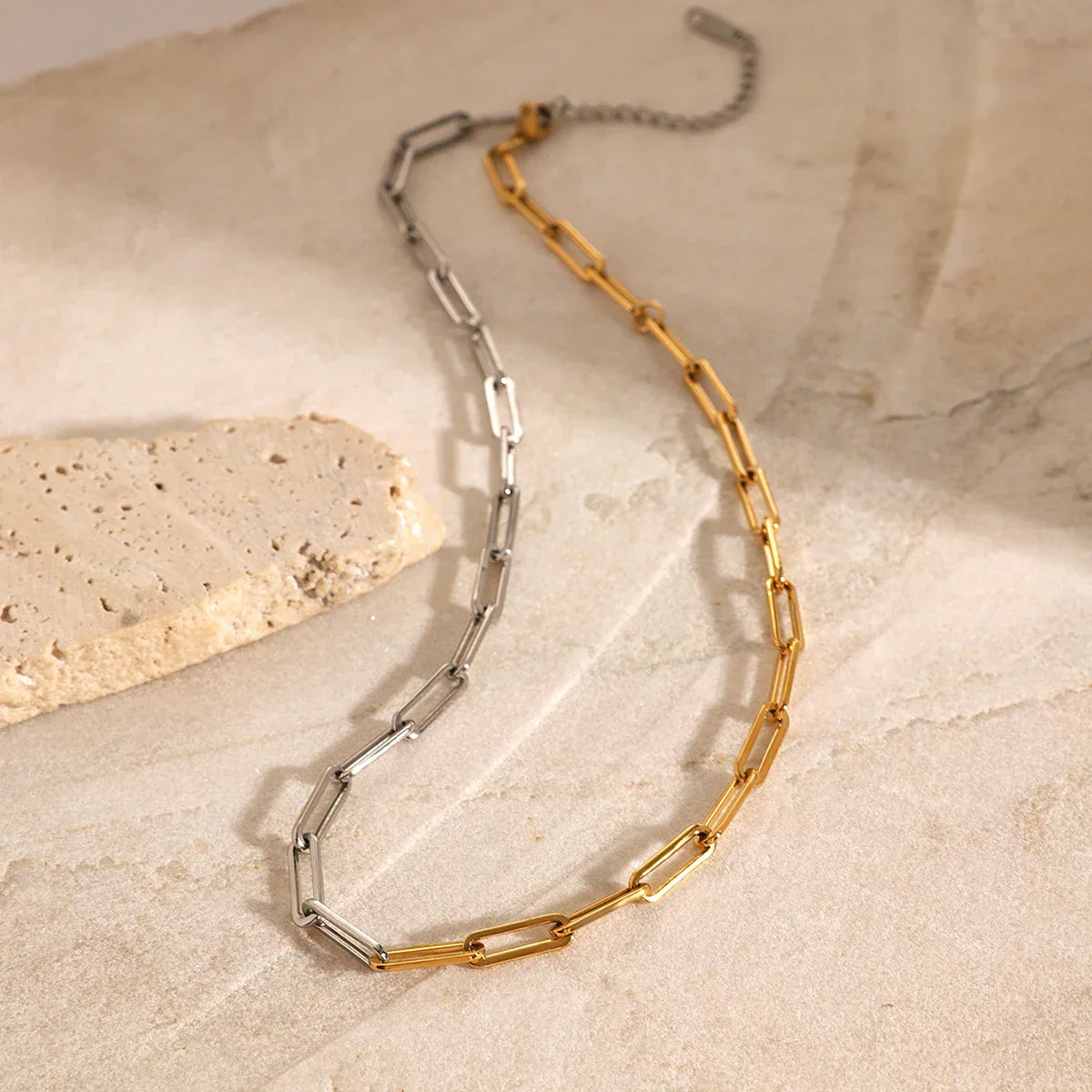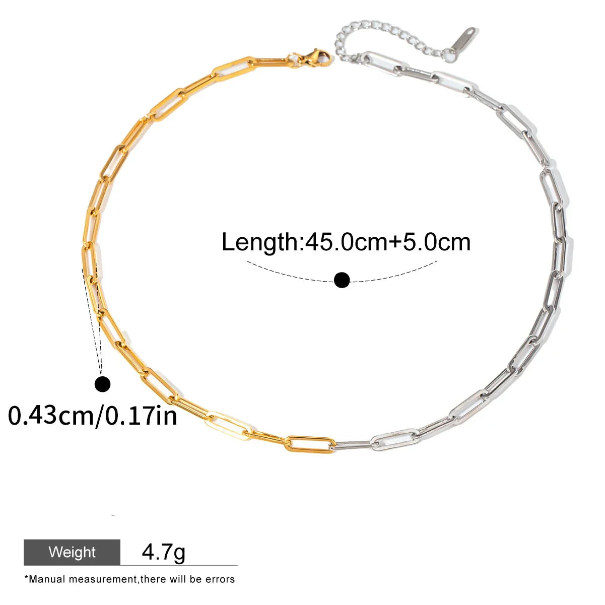 The Metallic Colorblock Chain Necklace is a striking blend of texture and contrast, designed to elevate your neckline with effortless edge. Featuring chunky, colorblocked links in metallic tones and a sleek, collar-style silhouette, this piece adds instant attitude to any outfit. Lightweight yet impactful, it’s perfect for layering or wearing solo as a standout centerpiece.