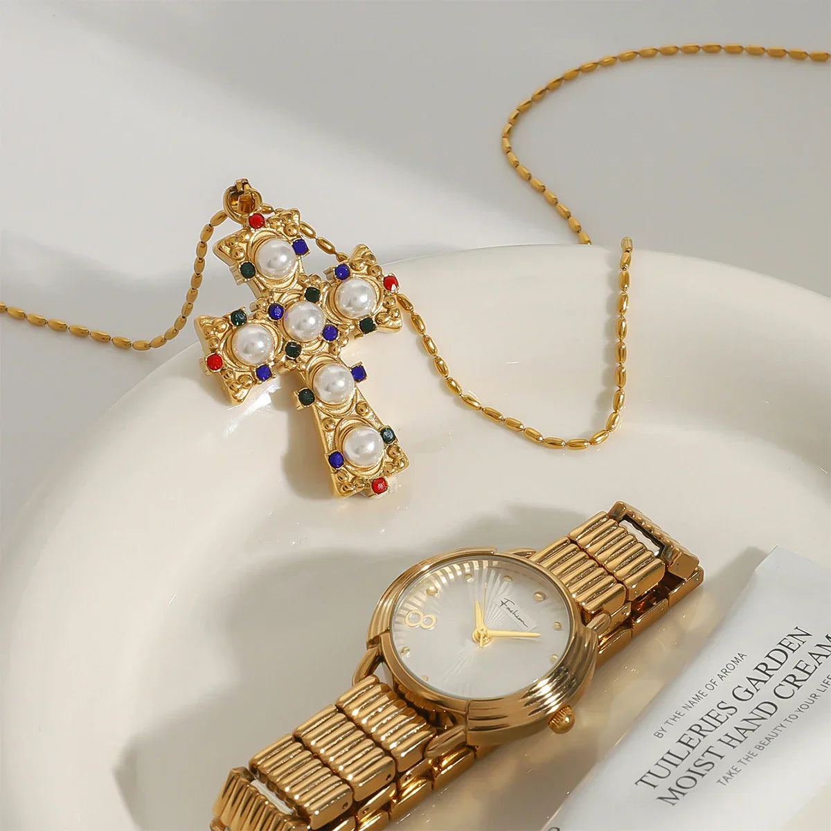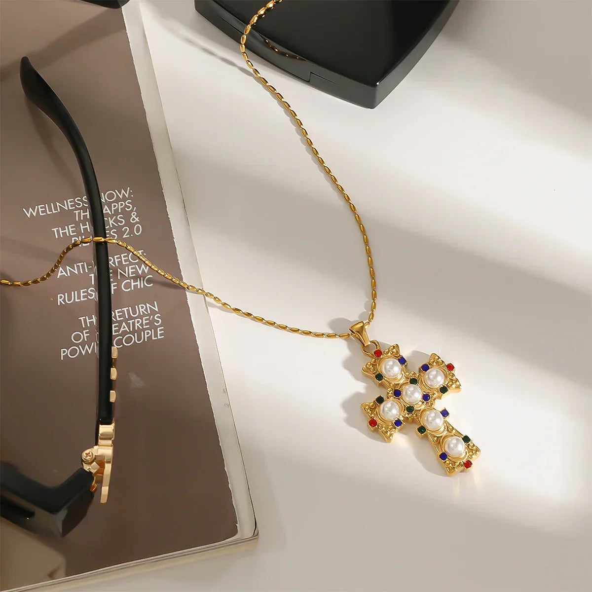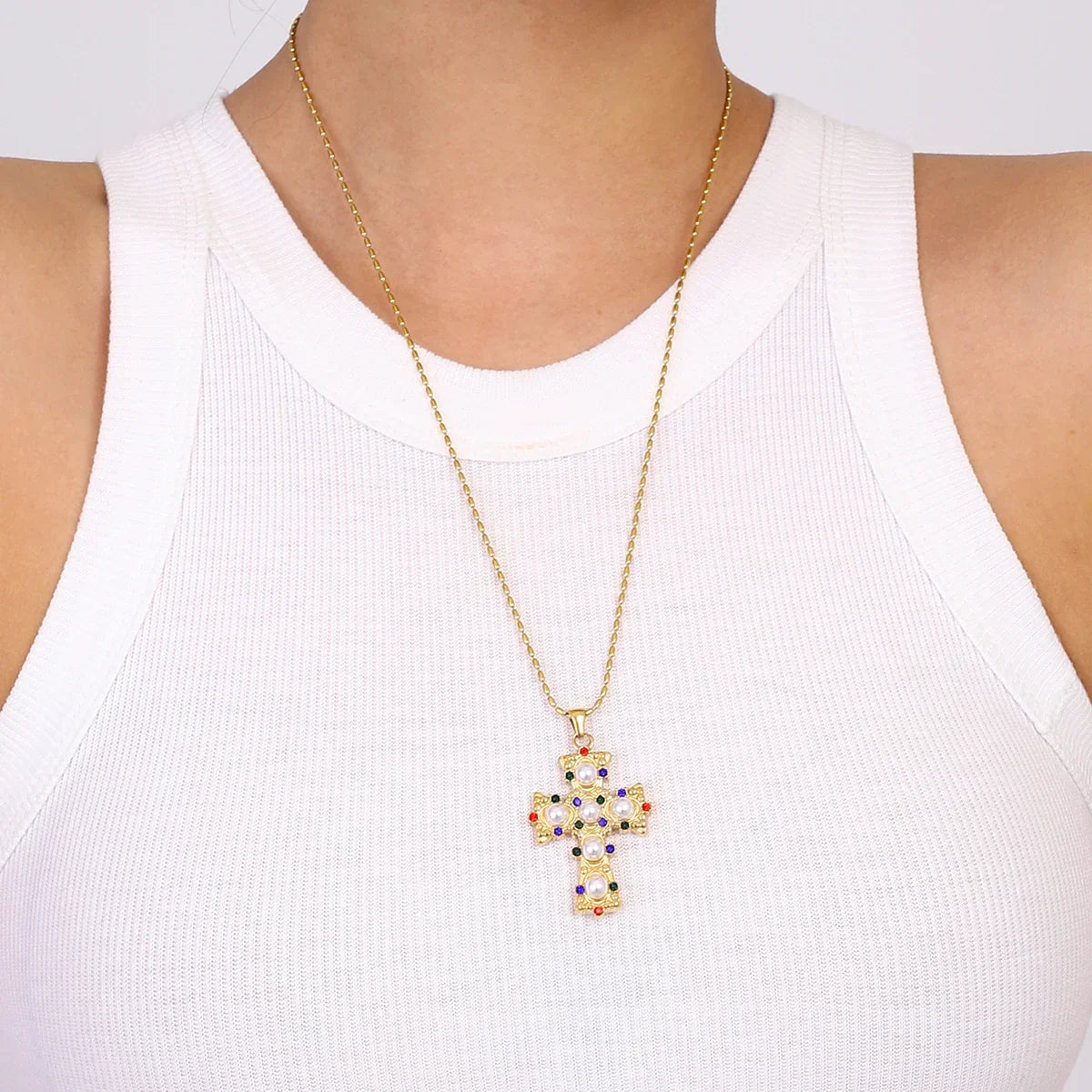 The Pearl & Colorful Zircon Cross Pendant Necklace blends timeless symbols with a modern, gender-neutral edge. Featuring a radiant cross adorned with multicolor zircon stones and paired with luminous pearl accents, this waterproof piece brings vibrant energy and meaningful style to any look. Unisex by design and crafted from durable, tarnish-resistant materials, it’s made to move with you — wherever life takes you.