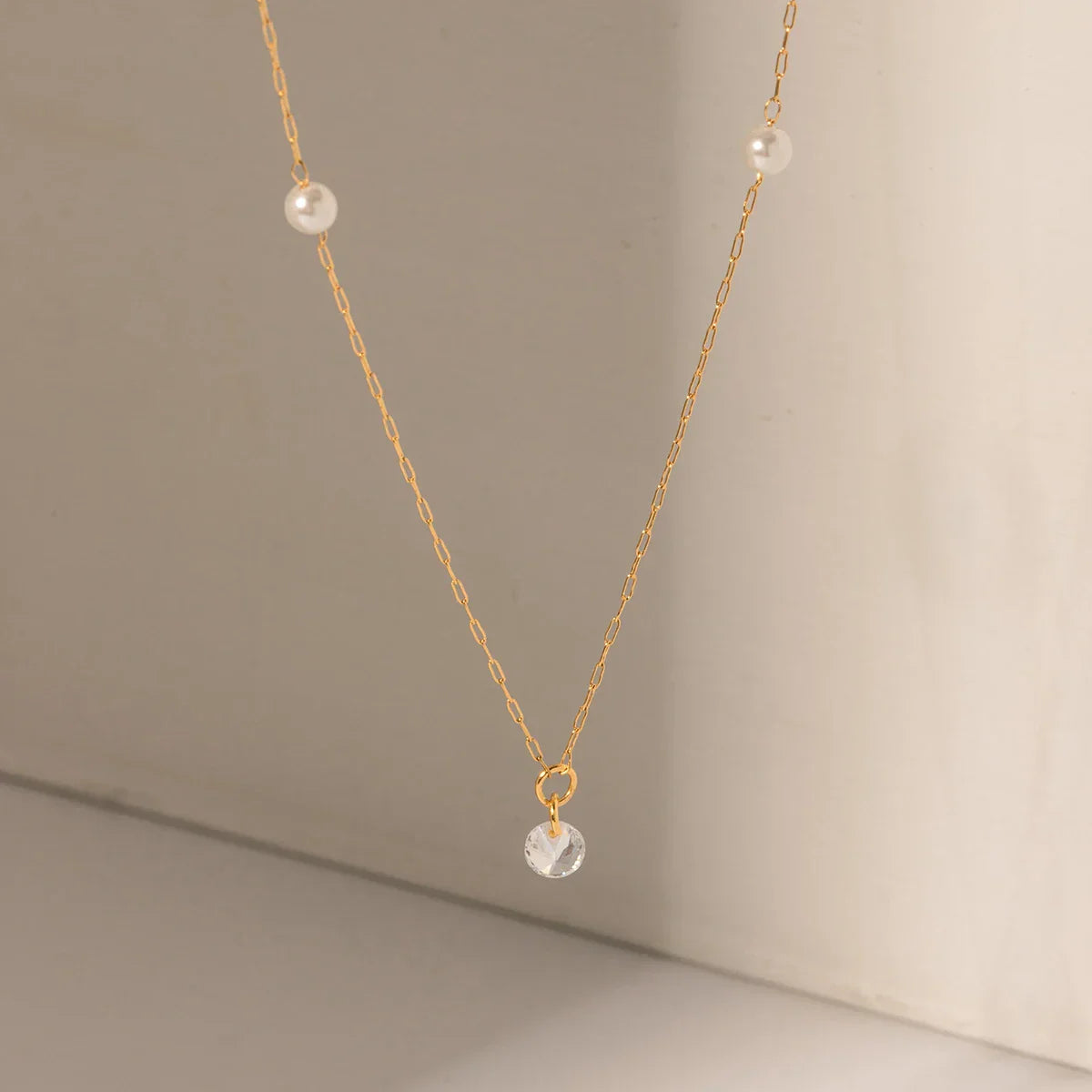 Discover the perfect blend of elegance and contemporary style with this trendy pearl and cubic zirconia pendant necklace. Its exquisite design makes it a standout accessory, ideal for elevating both casual and formal outfits. Crafted to be waterproof, this necklace is not only beautiful but also durable, ensuring it can be worn with confidence in any situation. Whether you're treating yourself or searching for a thoughtful gift, this necklace is a timeless choice that embodies sophistication and charm. Add a touch of luxury to your jewelry collection with this stunning piece!