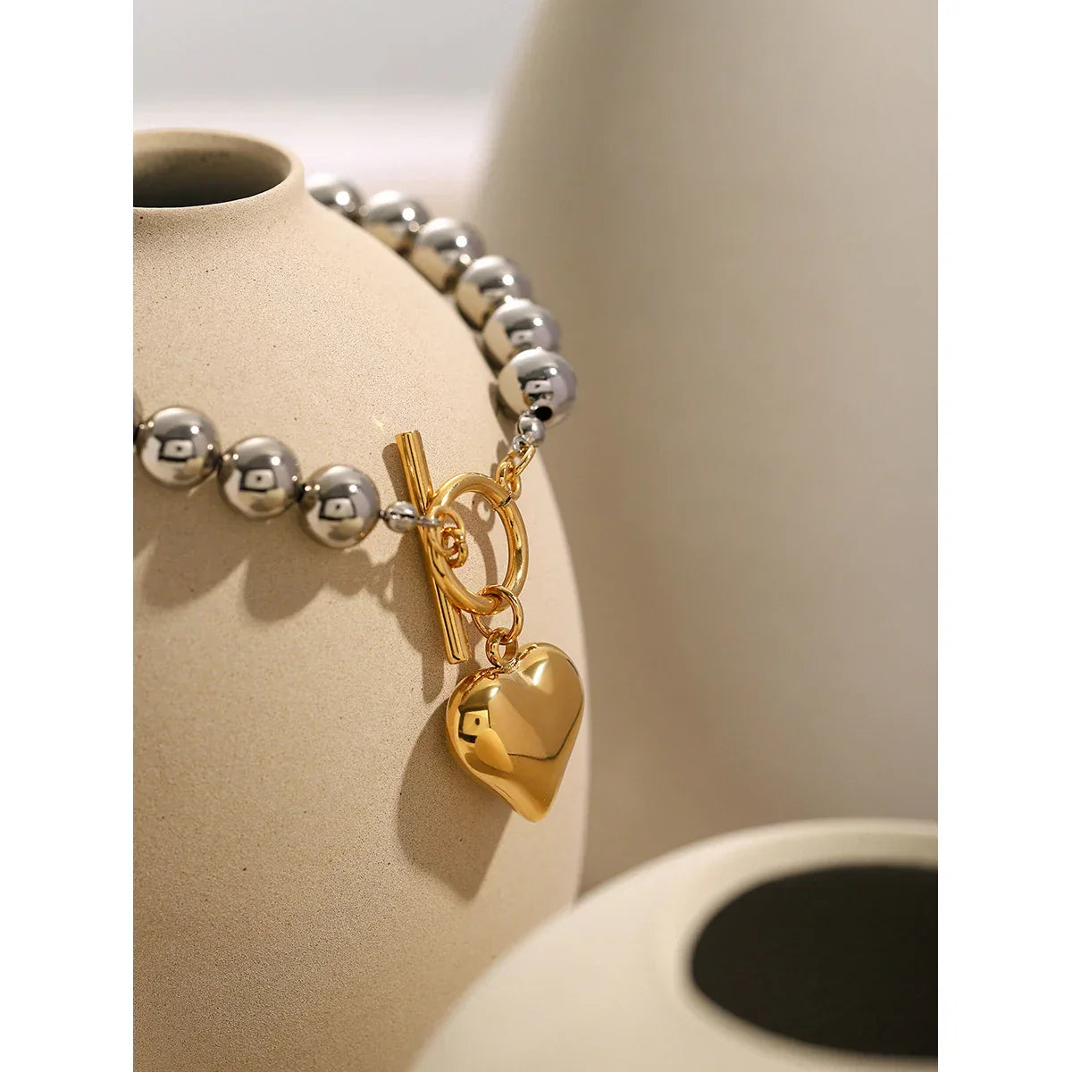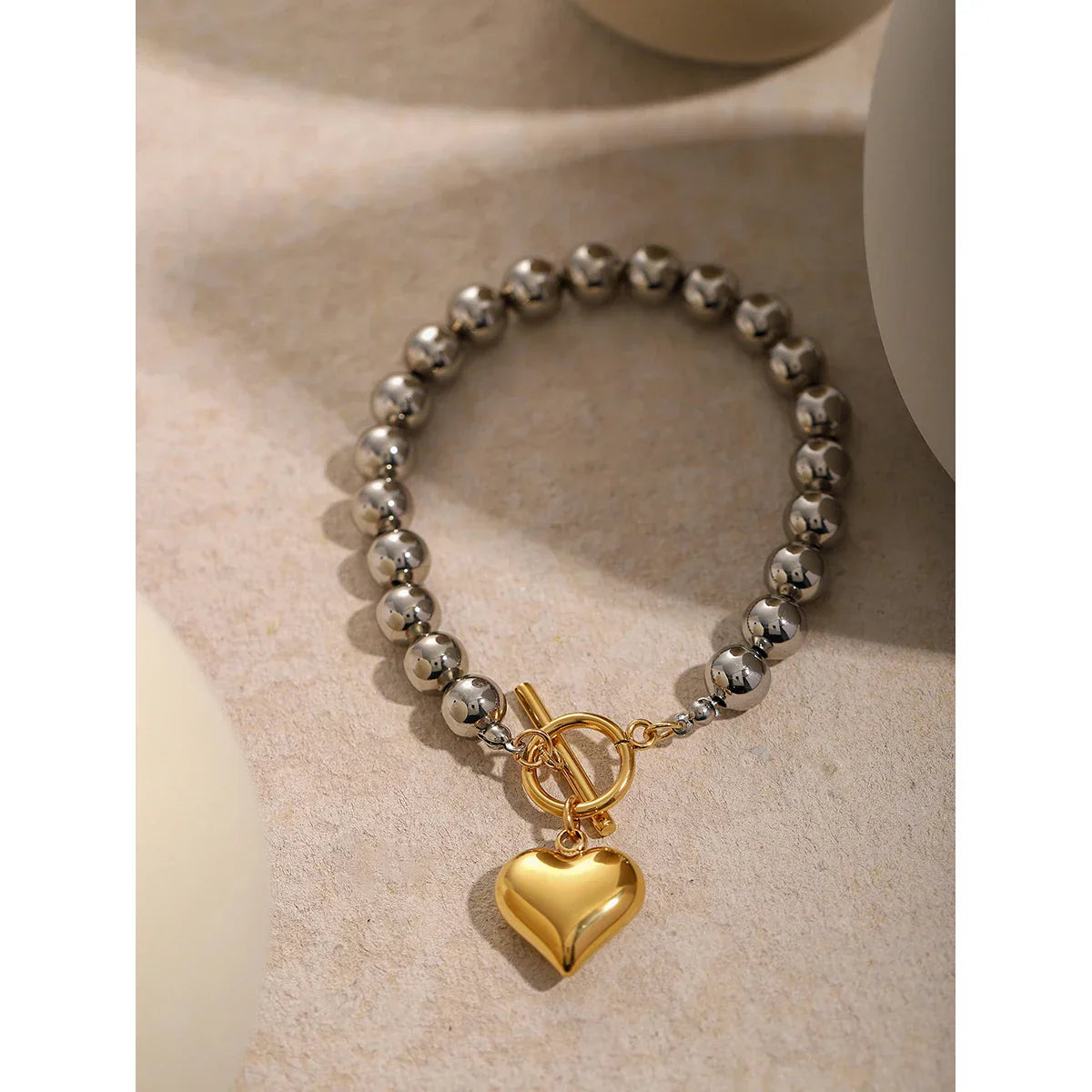 The Gold Heart & Silver Round Beads Bracelet Bangle is a stunning blend of elegance and sentiment. Featuring a radiant gold-colored heart charm paired with polished silver-tone beads, this waterproof piece adds refined sparkle to any outfit. Its sleek bangle design makes it perfect for galas, special occasions, or as a heartfelt gift for someone you love.