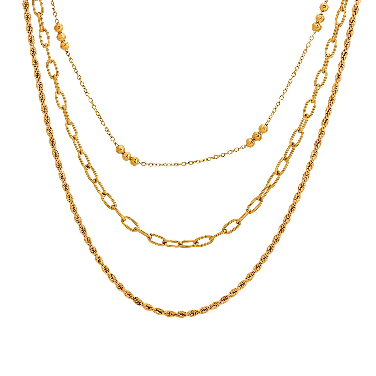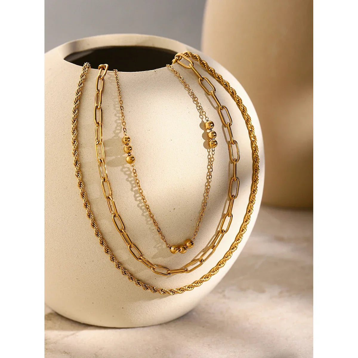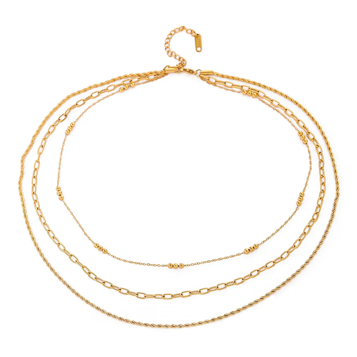 Elevate your accessory game with this stunning triple-layered necklace, designed to make a statement. Featuring a unique twist chain design, this piece adds a touch of modern elegance to any outfit. Its waterproof construction ensures durability, allowing you to wear it confidently in any setting. Perfect for layering or wearing alone, this trendy necklace is an essential addition to any jewelry collection, ideal for both casual and formal occasions. Embrace your style with this versatile and eye-catching accessory!