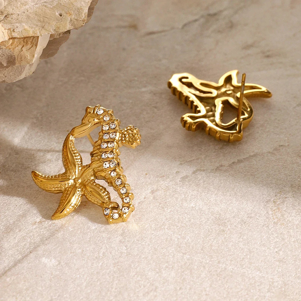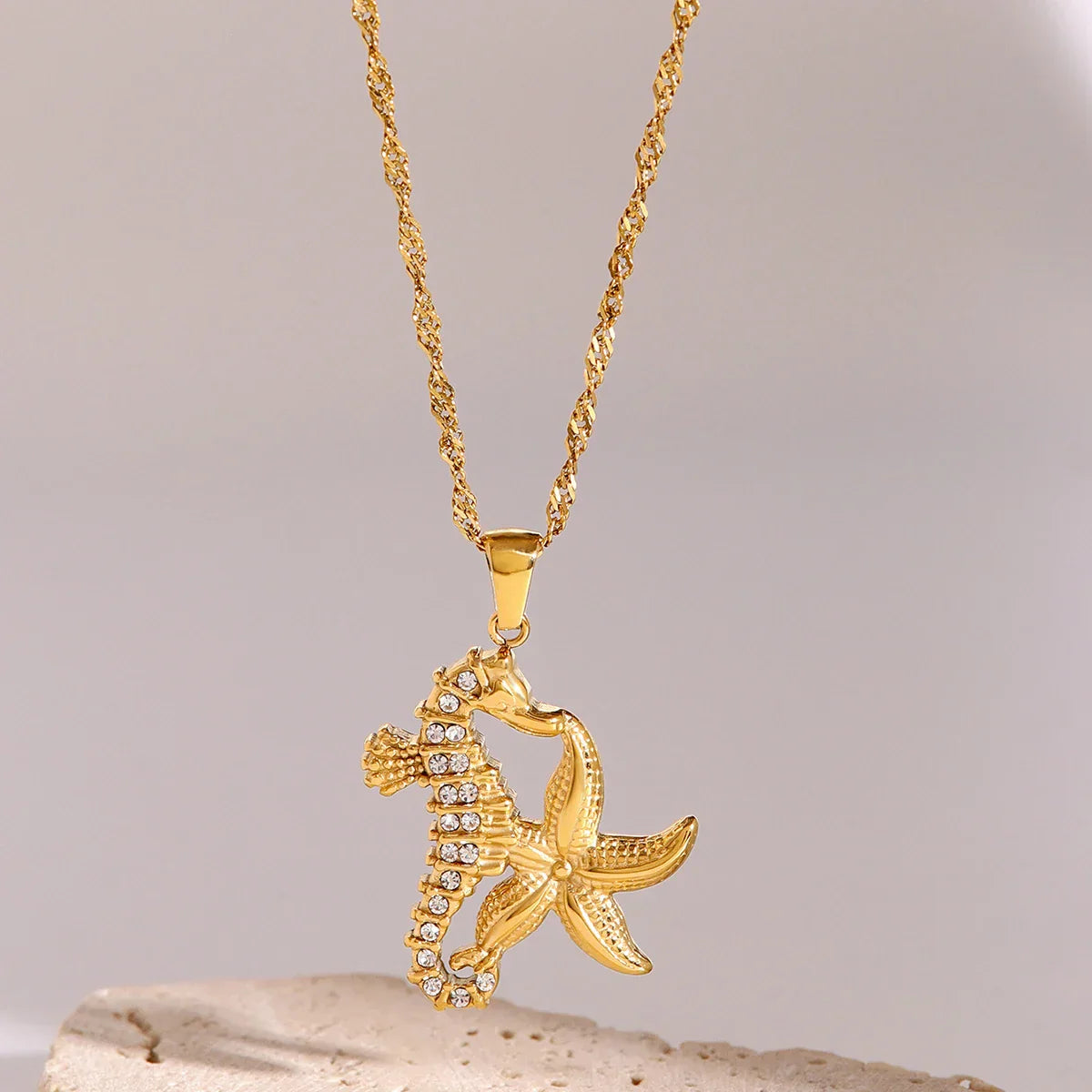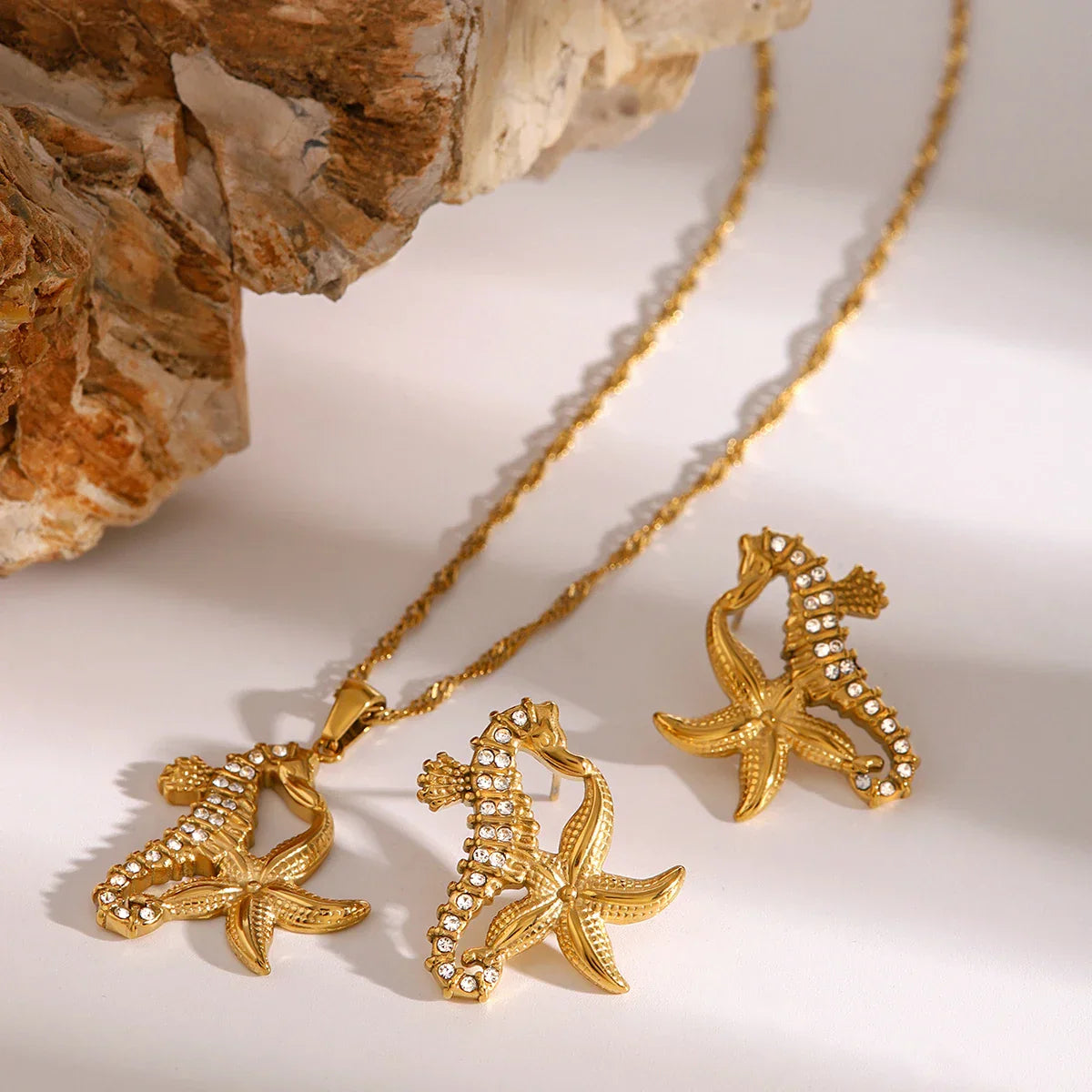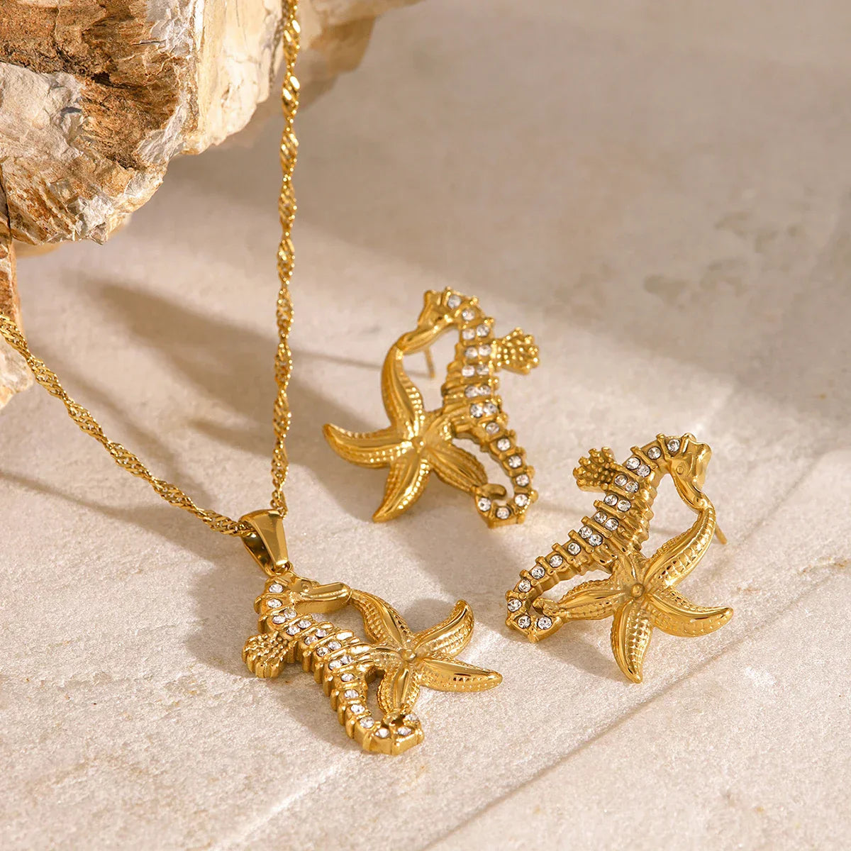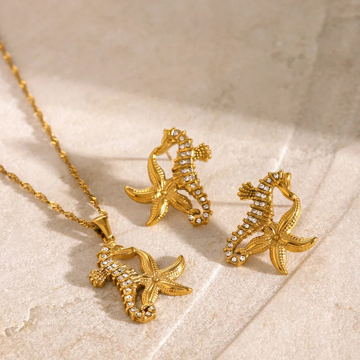 This sparkling zirconia inlaid seahorse and starfish pendant necklace and earrings set from the Ocean Series sounds beautiful! With its vibrant ocean-themed design, it likely captures the essence of marine life perfectly. The waterproof feature is a great bonus, making it suitable for beach outings or pool parties. Whether worn together or separately, this statement jewelry set would surely add a touch of elegance and whimsy to any outfit. Are you looking to purchase it or perhaps need styling tips?