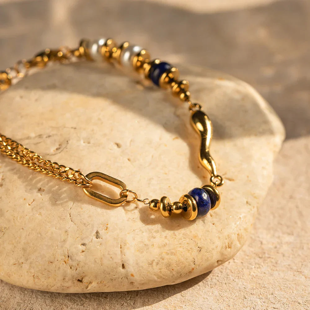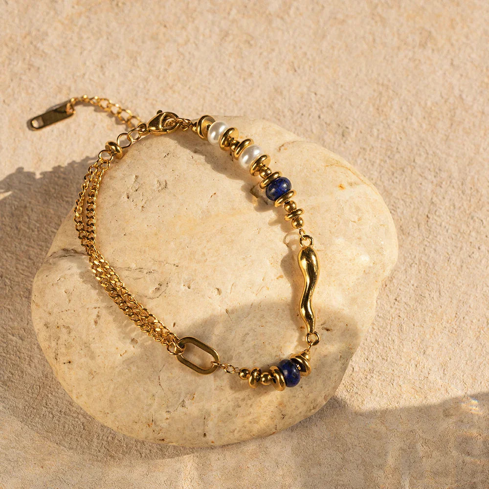 The Pearl & Lapis Lazuli-Shaped Water Drop Bracelet is a stunning blend of natural beauty and artistic design. Featuring pearl accents and a water drop-shaped metal casting inspired by the rich blues of lapis lazuli, this bracelet brings a sense of calm sophistication to any look. Crafted from waterproof, durable materials, it's perfect for daily wear or special occasions.