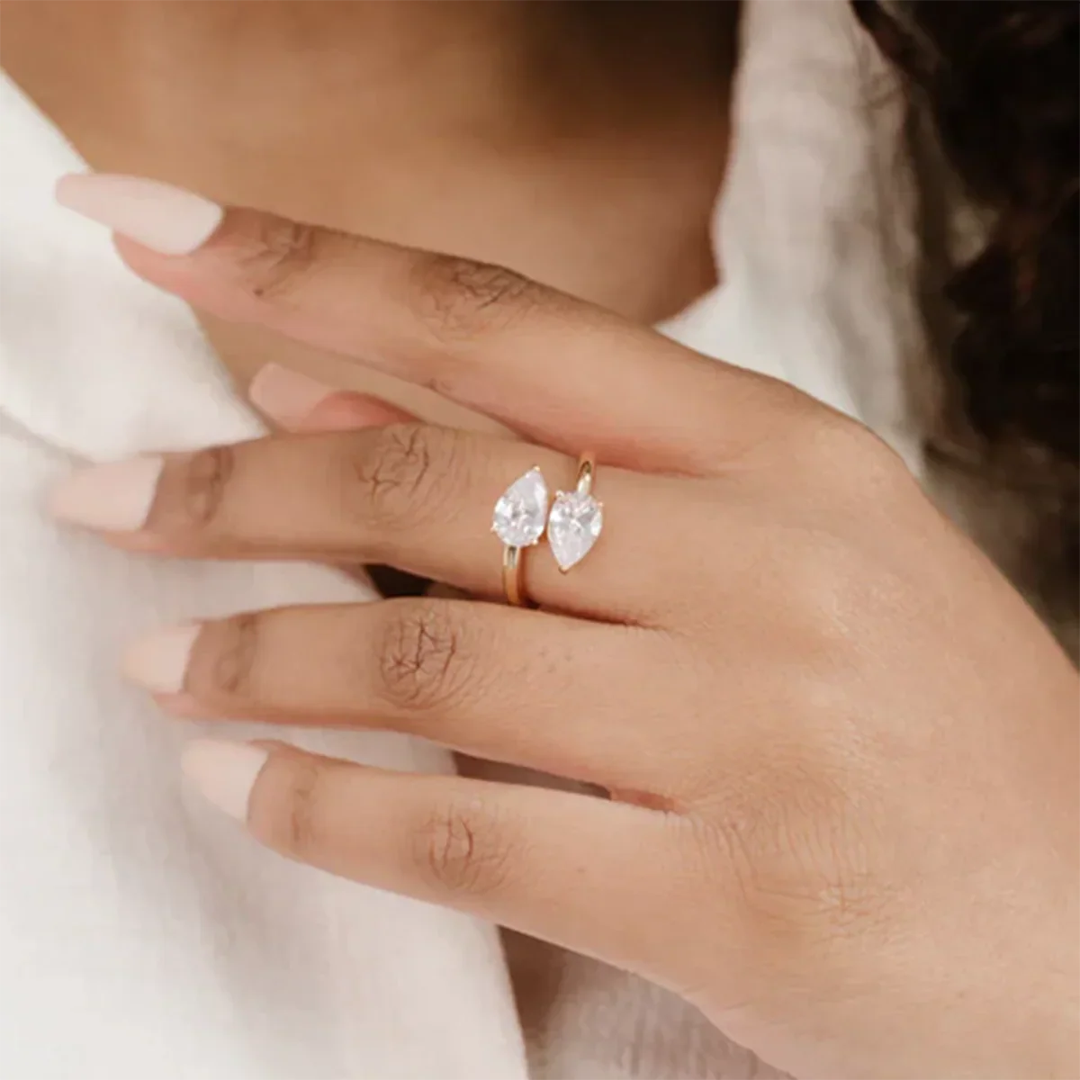 Add a touch of luxury to your style with this Elegant Asymmetric Green Double Teardrop Zirconia Ring. Designed with two sparkling green teardrop zirconia stones and a unique hollow opening, this ring offers a modern, sophisticated look. Perfect for weddings, special occasions, or everyday elegance, it’s a must-have for women who appreciate beauty, charm, and refined craftsmanship.