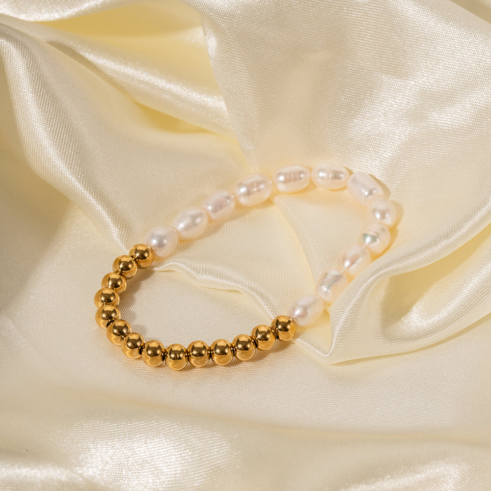 Trendy Stainless Steel Freshwater Pearl Round Bead Bracelet – Men and Women, Gold and Silver Color, Waterproof Jewelry