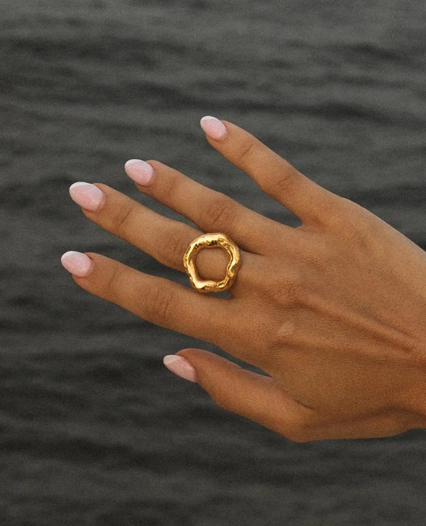 Unique Circle Motif Ring with Melted Texture Detail for Women - Gold Color, Waterproof, Elegant Gift