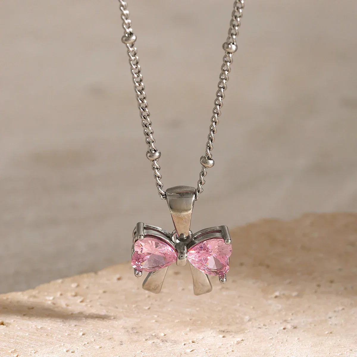 This chic collar necklace showcases a charming bow design, embellished with white cubic diamonds that catch the light beautifully. Its trendy aesthetic ensures it remains stylish and ready for everyday wear. this necklace makes a statement and is perfect for gifting or adding to a jewelry collection.