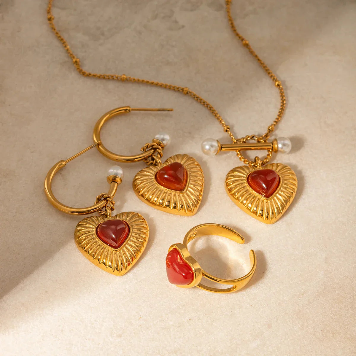 Introducing a stunning jewelry set featuring a beautifully crafted necklace, a heart-shaped ring, and elegant earrings designed for comfort and style. This set showcases a vibrant heart motif that adds a touch of romance and elegance to any outfit. Ideal for gifting, each piece combines timeless design with a modern flair, ensuring it will be cherished for years to come. Perfect for special occasions or as a heartfelt surprise for a loved one, this set is sure to make a statement. Enjoy the confidence of wearing hypoallergenic pieces, making them suitable for all skin types.